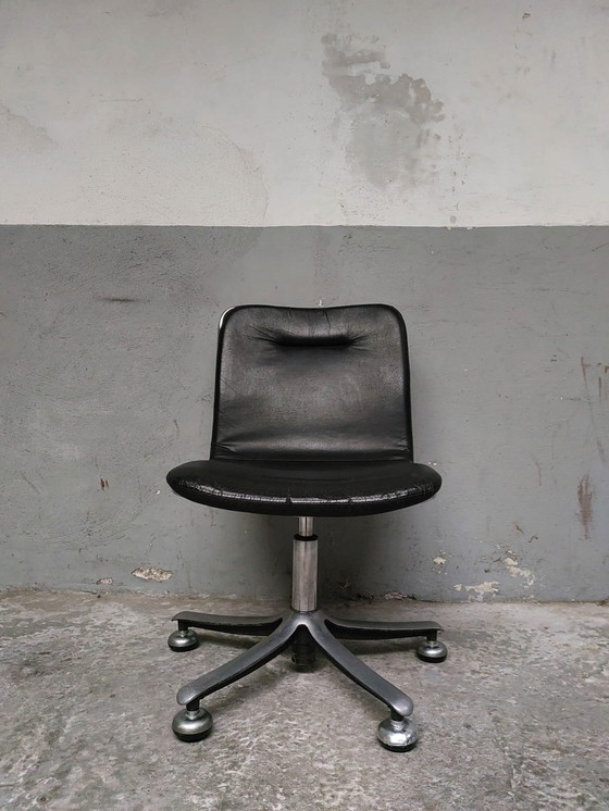 Sedia da scrivania Swissform in cromo e pelle nera di Sitag, anni '70