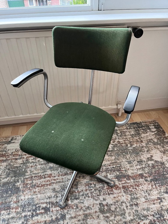 La struttura grigia è rivestita con il tessuto verde originale. Avrei voluto farla rivestire, ma non si adatta più agli interni. L'altezza di questa sedia di design olandese è regolabile, così come lo schienale.