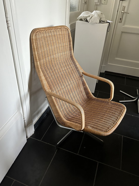 Iconica sedia girevole vintage del designer olandese Dirk Can Sliedregt per Gebroeders Jonker Noordwolde. Il modello 614c presenta una seduta in rattan e una base cromata. Minimalismo olandese senza tempo.