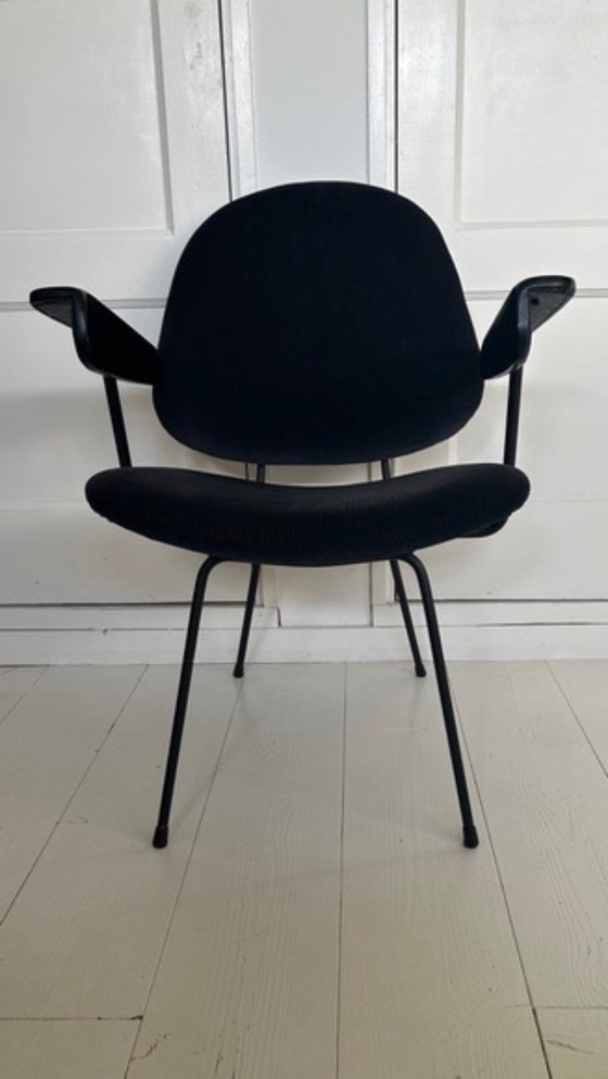Questa è una poltrona Kembo 302 Easy Chair, una poltrona molto comoda e robusta progettata da Willem Gispen nel 1952. Rivestita con un tessuto per mobili nero.