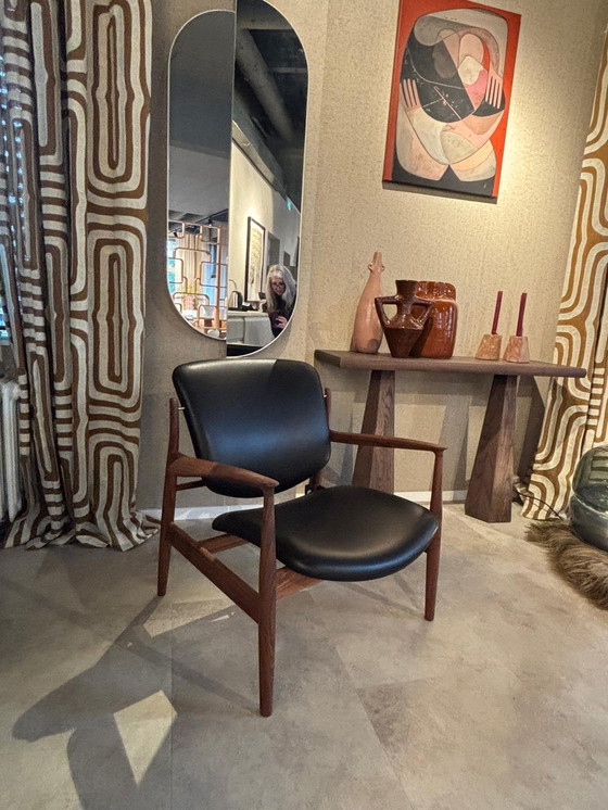 La sedia France di House of Finn Juhl, nota anche come FJ 136, è stata progettata alla fine degli anni '50 per il mercato americano. Una splendida poltrona che diventerà il punto focale del vostro soggiorno. Il design vintage è sorprendentemente contemporaneo. La struttura in legno è in noce e il rivestimento è in pelle nera, cucita a mano. Una sedia davvero splendida, splendidamente realizzata e incredibilmente comoda. Ne rimarrete entusiasti.