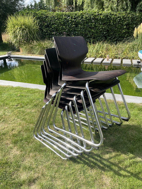 Un set di sei sedie originali Pagholz Flötotto, progettate in Germania negli anni '60 e '70. Sono in discrete condizioni vintage. A una sedia manca un pezzo all'angolo. C'è un po' di ruggine nella parte inferiore della seduta, ma non è visibile. Splendide in qualsiasi interno!