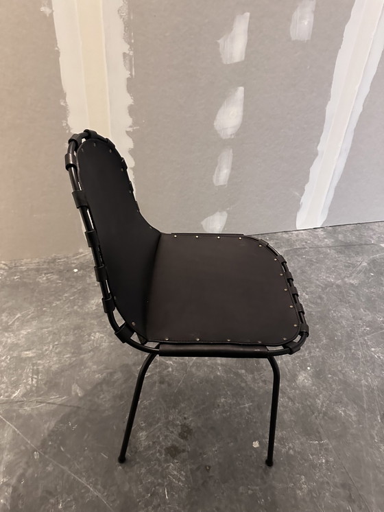 Questa sedia è nuova, realizzata in pelle con graziosi dettagli come le cinghie sotto la seduta che ricordano una sella spagnola. Presenta qualche segno di usura sulla seduta, dato che è stata in negozio ma non è mai stata usata.