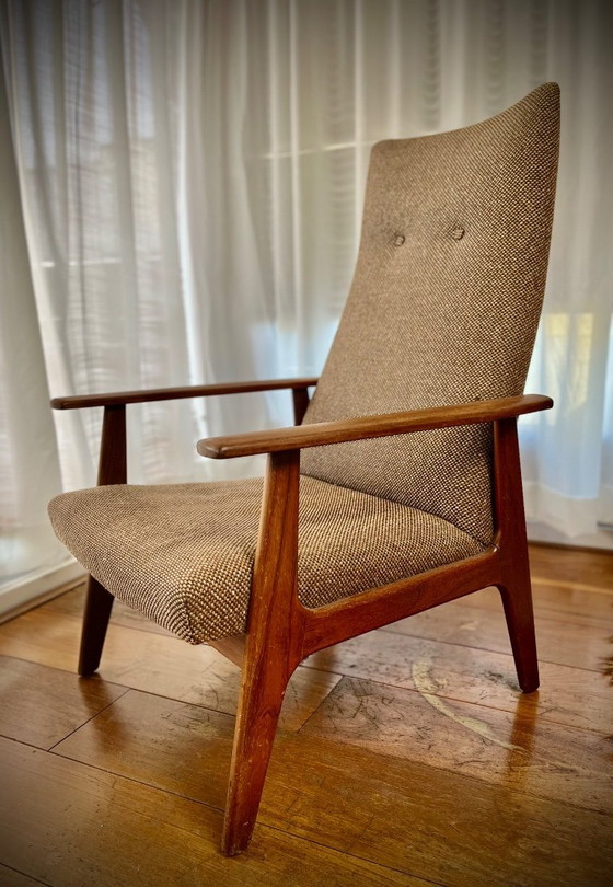 Bellissimo faiteuil in teak di Topform. In ottime condizioni. Rivestito, tessuto marrone.