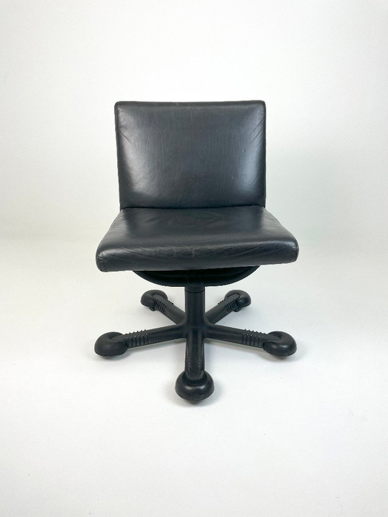 Sedia girevole Mix di Afra & Tobia Scarpa, realizzata da Molteni negli anni Settanta. La struttura in alluminio pressofuso forma un elegante elemento a gondola che si aggancia ai lati della seduta. Rivestita in pelle nera. In ottime condizioni, come da foto.