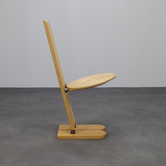 Sedia scultorea e molto particolare di Gigi Sabadin, disegnata per Emme negli anni Settanta. Pala è caratterizzata da un alto schienale eretto, da una seduta circolare intrecciata e da una base divisa a mo' di sci, che fonde elementi di ispirazione popolare con l'audace geometria del design postmoderno italiano.