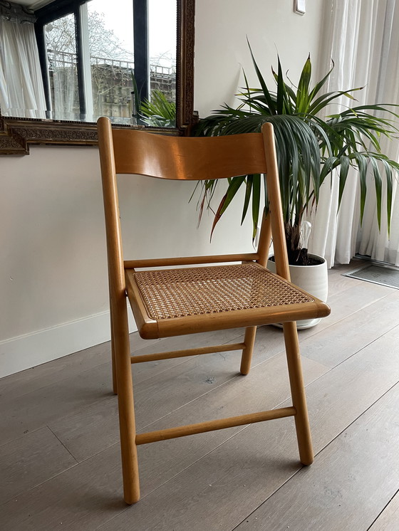Bellissima sedia pieghevole in faggio con seduta in fettuccia e schienale in legno curvato.
