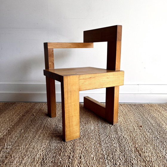 Un'iconica sedia in rovere massello disegnata da Rietveld. Progettata nel 1963 per il rinomato gioielliere Steltman dell'Aia, l'esclusivo design asimmetrico della sedia, che rivela un'immagine intrigante da ogni angolazione, nelle linee e nei piani, è la firma dello stile di Rietveld. Questa versione senza marchi è stata realizzata negli anni '80 e mostra lievi segni di usura dovuti al tempo.
