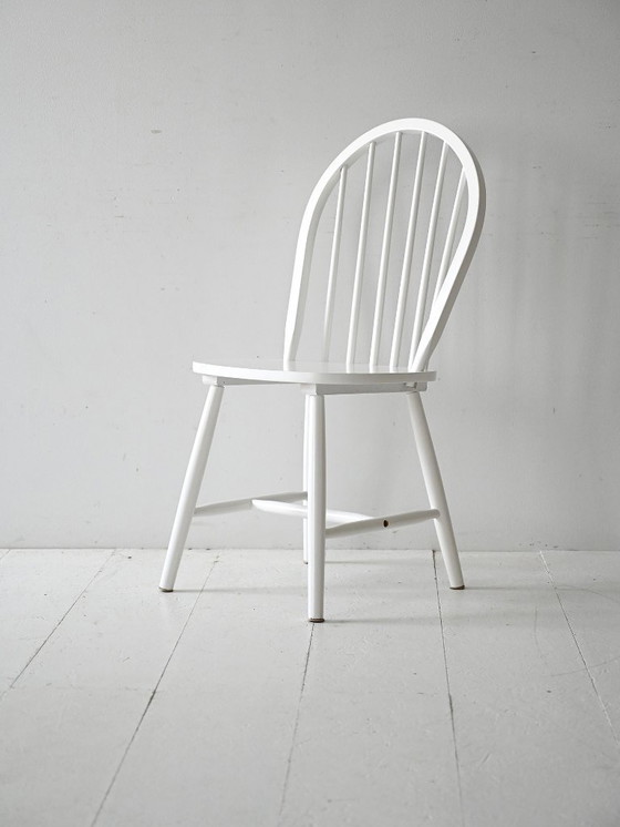 Sedia contemporanea in legno laccato bianco, ispirata all'iconico design scandinavo degli anni '60. La forma richiama il classico modello Pinstolar con schienale curvo a doghe e seduta generosa e leggermente concava. Le linee pulite ed essenziali conferiscono a queste sedie un fascino versatile e senza tempo.