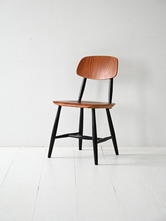 Sedia vintage scandinava con struttura laccata nera e seduta e schienale in teak con sottili venature scure. Le linee semplici e ben proporzionate esaltano il contrasto tra la solida struttura nera e le tonalità naturali del legno. L'equilibrio visivo emerge dal dialogo tra forme pulite e materiali autentici.