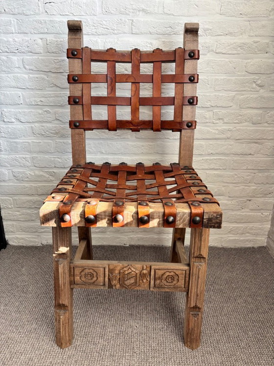 Sedia spagnola in legno con seduta e schienale in cuoio intrecciato
