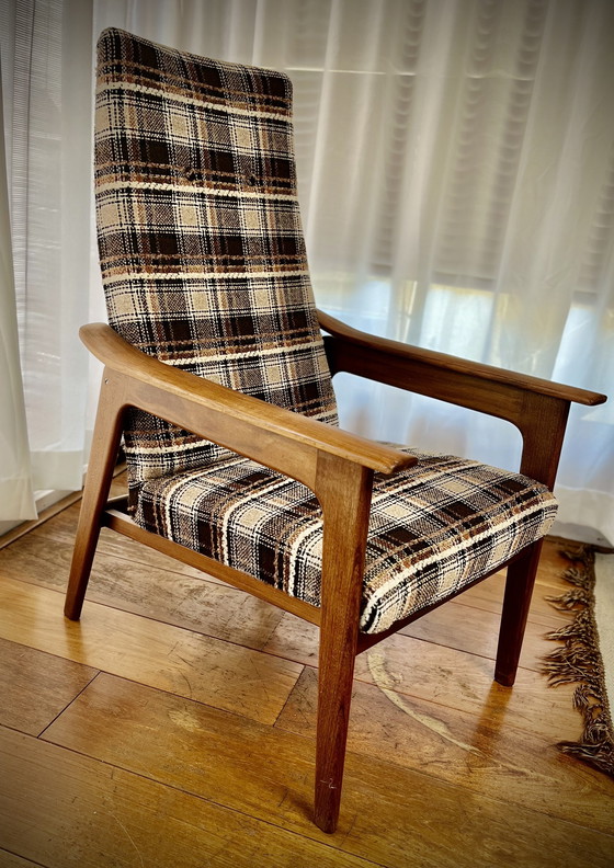 Questa poltrona lounge, probabilmente Topform, è un meraviglioso esempio di design moderno di metà secolo. Ha una robusta struttura in legno con uno schienale alto e comodi braccioli. Il rivestimento è un classico motivo a quadri nei toni del marrone e del beige, che aggiunge un tocco di fascino vintage. Perfetta per qualsiasi salotto o studio, questa sedia combina senza sforzo stile e comfort.