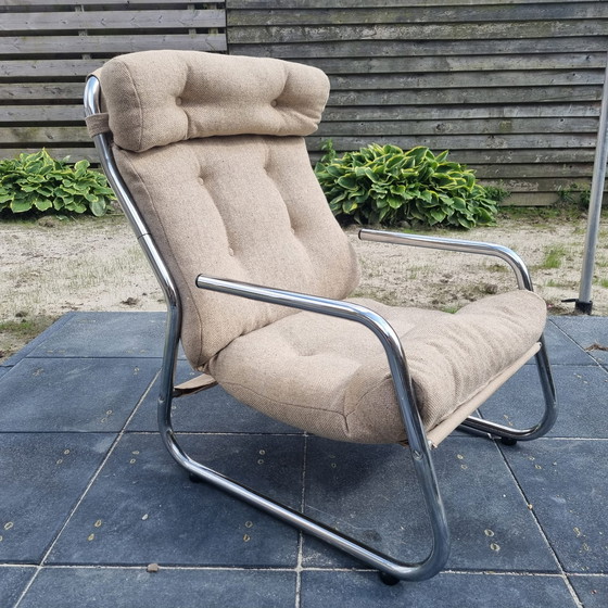 Questa sedia vintage di Gillis Lundgren è una splendida aggiunta a qualsiasi interno. Con il suo comodo rivestimento in tessuto beige e la robusta struttura cromata, questa sedia offre stile e durata. Il design è senza tempo e si adatta perfettamente agli interni vintage o retrò. Ideale per il soggiorno o come poltrona d'accento in un angolo lettura.