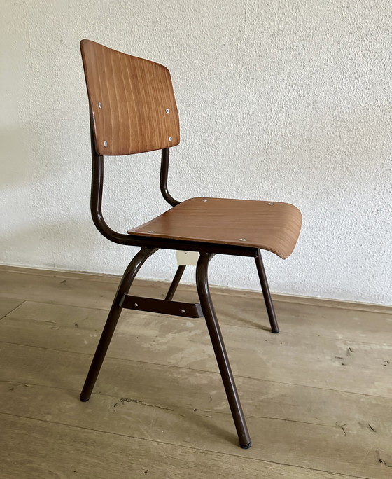 Deliziosa sedia vintage per bambini con struttura in metallo marrone e seduta e schienale in legno pressato Pagholz.