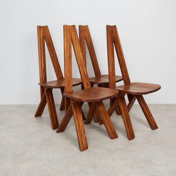 Una collezione di quattro sedie note come "Chlacc", parte del modello S45, progettate da Pierre Chapo nel 1979. Il nome "Chlacc" deriva dal processo di fabbricazione brevettato utilizzato per creare queste sedie. La S45 è una delle creazioni più scultoree e compiute dell'opera di Pierre Chapo. La loro struttura sottile e leggera conferisce a questa seduta un aspetto aggraziato, controbilanciato dalla solida struttura in olmo.
