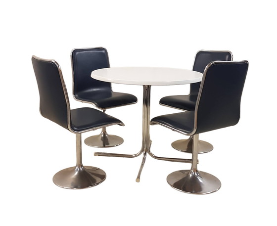 Queste sedie a tromba a tulipano dell'era spaziale Tacke degli anni '70 sono una splendida aggiunta a qualsiasi sala da pranzo retrò o moderna. Il tavolo è stato venduto in precedenza e non è più disponibile. Le sedie hanno un design iconico con una base a tromba in metallo e una comoda imbottitura in skai. Esse emanano un fascino vintage unico che si adatta perfettamente allo stile Space Age.