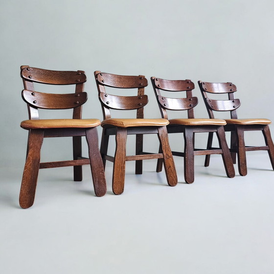 Lasciati conquistare dal design audace e sorprendente di questo set di quattro sedie brutaliste, perfette per aggiungere un tocco di stile architettonico alla tua sala da pranzo o al tuo soggiorno. Realizzate in legno robusto e impreziosite da morbide sedute in pelle, queste sedie offrono comfort ed eleganza.