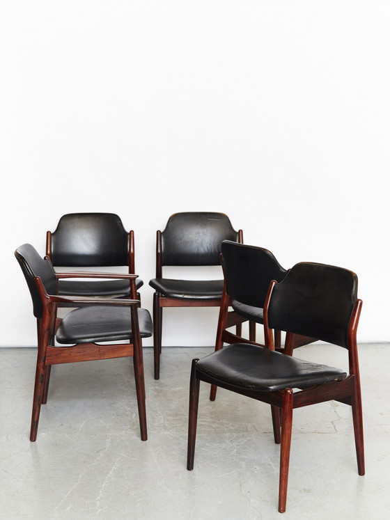 Arne Vodder è stato un designer e architetto danese. Era un caro amico di Finn Juhl ed è considerato una delle figure più importanti del design danese odierno. Il lavoro di Vodder è caratterizzato da una perfetta combinazione di semplicità, funzionalità ed estetica sofisticata. I suoi design senza tempo ed eleganti sono oggi oggetti ricercati da collezionisti e galleristi. La pelle presenta gravi segni di usura, con alcune parti aperte. Da qui il prezzo relativamente basso. Le cornici sono in buone condizioni.