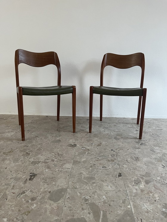 In vendita una coppia di sedie da pranzo originali Modello 71, disegnate da Niels Otto Møller e prodotte da J.L. Møllers Møbelfabrik. Si tratta di autentici pezzi d'epoca originali; il timbro del produttore all'interno ne conferma la provenienza.