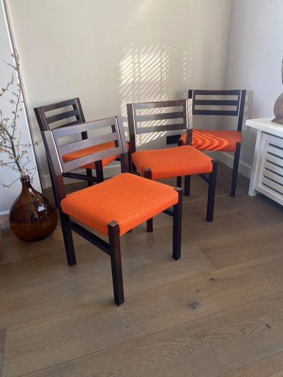 Sedie da pranzo di design vintage di Arnold Merckx - Fristho Franeker, anni '60/'70, set di quattro. Altezza totale 77,5 cm, larghezza totale 48 cm, profondità totale oltre 45 cm. Altezza seduta 45,5 cm, larghezza seduta 48 cm, profondità seduta 41,5 cm. Il rivestimento di una seduta presenta leggere macchie. Una gamba presenta un piccolo strappo nella parte superiore, ma ciò non compromette la robustezza o il comfort della seduta. Venduto solo in set.