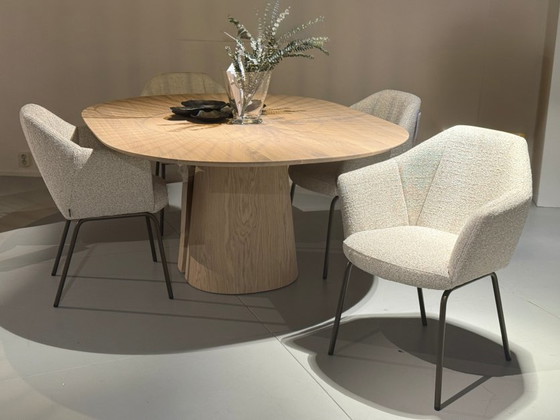 __ Queste quattro sedie da pranzo Muk di Cartel Living presentano cuciture a rombi sullo schienale. Conferiscono alla sedia un effetto giocoso, quasi grafico, senza risultare eccessive. I braccioli leggermente svasati favoriscono una postura aperta a tavola. La seduta è ampia e avvolgente, garantendo un comfort immediato. Il tessuto Be Special è un ricco bouclé con una trama ruvida e screziata nei toni del beige e della sabbia. Questo non solo dona calore alla sedia, ma anche profondità all'ambiente. La base in marrone anodizzato si abbina splendidamente, creando un insieme elegante e armonioso.