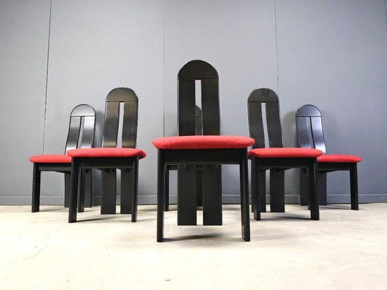 Sedie da pranzo dal design postmoderno con struttura in legno nero e un sorprendente cuscino in tessuto rosso.