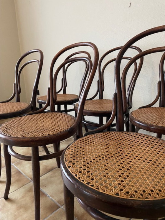 Scopri il fascino di queste sei splendide e iconiche sedie Thonet n. 14. Questo set è un vero e proprio colpo d'occhio per la tua sala da pranzo e porta un tocco di eleganza vintage alla tua casa.