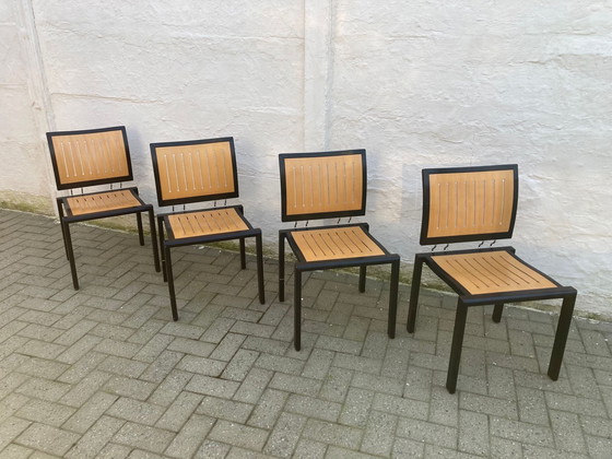Set di 4 sedie da pranzo Quadro, disegnate da Bruno Rey e prodotte da Dietiker in Svizzera alla fine degli anni '80. Le sedie sono impilabili. Presentano normali segni d'uso sulla struttura nera. Sedie molto robuste.