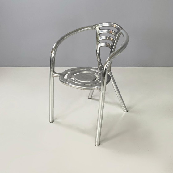 Vendo Set di 4 Sedie Modello Boulevard con seduta tonda, interamente in alluminio (vendibile anche singolarmente). La seduta e lo schienale hanno delle forature decorative dalle linee curve e la struttura dei braccioli e delle gambe è composta da un tubolare in alluminio. Utilizzabile anche in un ambiente esterno come un giardino o un terrazzo.