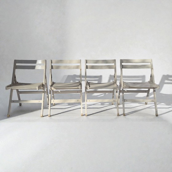 Un set di quattro sedie pieghevoli senza braccioli prodotte da Fratelli Reguitti in Italia. Le sedie sono realizzate in legno con finitura laccata bianca e presentano un classico design con schienale a doghe. Il meccanismo pieghevole permette alla struttura di ripiegarsi completamente per facilitarne lo stoccaggio e il trasporto. Condizioni: tre sedie sono in buone condizioni d'uso, con normali segni del tempo e leggera usura superficiale. La quarta sedia presenta danni strutturali ed è inclusa nel lotto gratuitamente (3 + 1 gratis) per restauro o parti di ricambio.