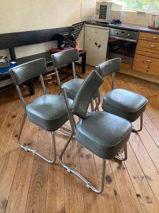 Queste sedie sono un'ottima scelta per gli amanti del design vintage. Sono state rivestite qualche anno fa e ora necessitano di un po' di manutenzione. Una seduta è allentata, lo schienale di una sedia è allentato e un'altra sedia presenta lievi danni alla similpelle. Vedi foto.
