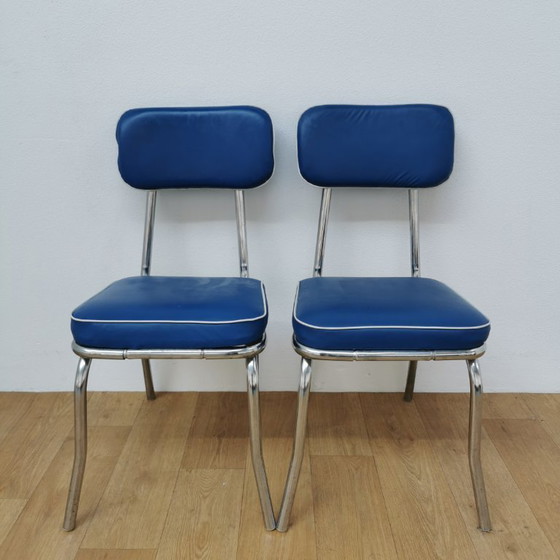 Sedie da cucina vintage in similpelle. Queste splendide sedie da cucina hanno una struttura cromata e un rivestimento in similpelle blu intenso. Sono l'aggiunta perfetta al tuo arredamento.