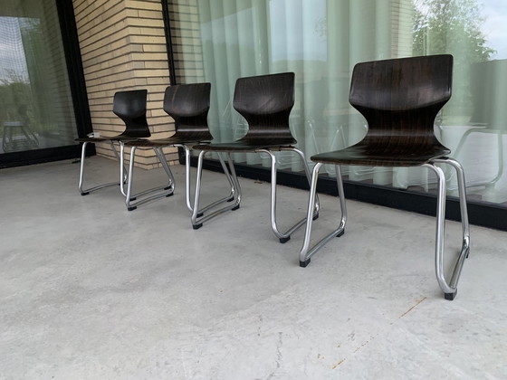 Sedia Pagwood di Adam Stegner per Flötotto. Set di 4 sedie per bambini. Larghezza 33,5 cm, profondità 37 cm e altezza 64 cm. Altezza seduta: 36 cm. Leggera, impilabile, funzionale ed elegante. Design tedesco degli anni '60. Buone condizioni vintage, lievi segni di usura e patina di ruggine dovuta all'età.
