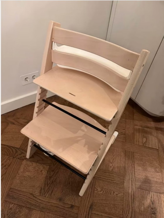 Seggiolone Tripp Trapp completo con pratico cestino portaoggetti bianco. Il seggiolone è in buone condizioni e il cestino offre spazio extra per riporre giocattoli o bavaglini, ad esempio. Ideale per i bambini che vogliono sedersi da soli a tavola. Tripp Trapp è un seggiolone che cresce con te ed è regolabile, quindi può essere utilizzato per anni.