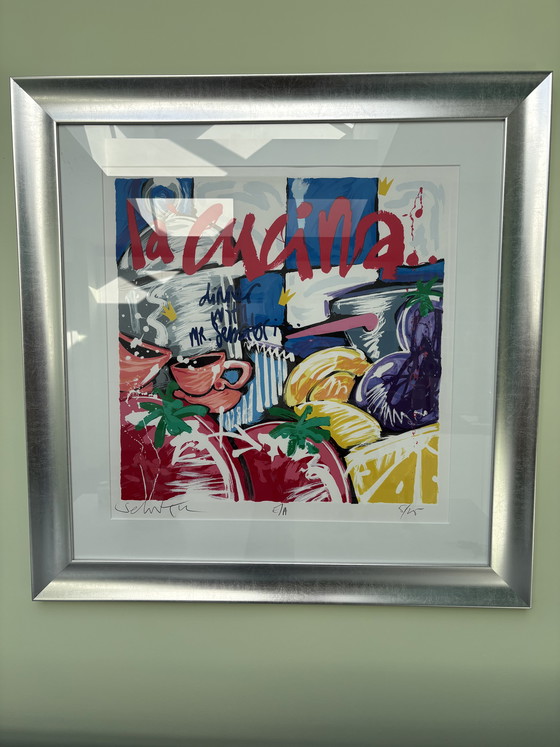 Porta un tocco di arte moderna nei tuoi interni con questa splendida serigrafia di Selwyn Senatori. Questa composizione colorata, intitolata "La Cucina", cattura la vibrante energia di una cucina italiana in un'esplosione di colori e forme. L'opera è incorniciata con maestria in un'elegante cornice color argento, che le conferisce un aspetto sofisticato in grado di ravvivare qualsiasi ambiente.