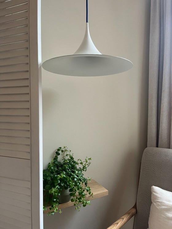 Questa è una classica lampada a sospensione a semicerchio, nota anche come "Witch Hat", disegnata da Torsten Thorup e Claus Bonderup per Fog & Mørup. Il suo elegante design conico crea una luce calda e soffusa, perfetta sopra un tavolo da pranzo, un blocco cucina o in soggiorno. Un esempio senza tempo di illuminazione moderna danese di metà secolo.