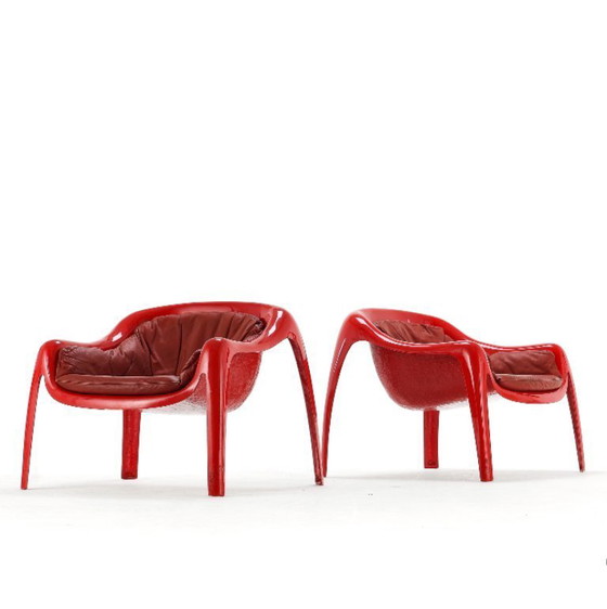 Sergio Mazza per Artemide: Due sedie spaziali in plastica rossa stampata, cuscino stampato con rivestimento in pelle rossa.