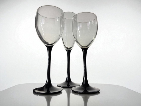 Servizio 24 bicchieri Luminarc Francia. 8 calici flute champagne, 8 calici vino rosso, 8 calici vino bianco/acqua. Gambo nero, vintage primi anni '80.