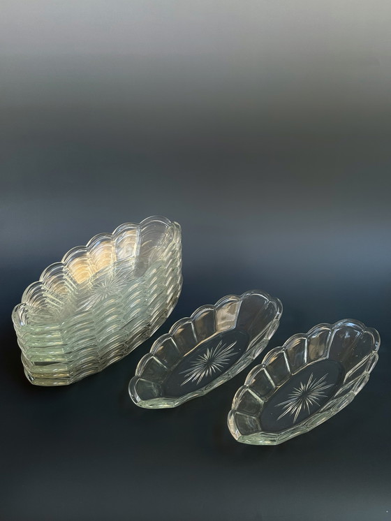 Servizio Brockwitz "Chicago" - Set di 10 ciotole ovali per cetrioli (Art Déco, 1936) Questo elegante set di 10 ciotole ovali in vetro pressato fa parte del servizio "Chicago" di Brockwitz Glasfabrik, prestigiosa vetreria tedesca fondata nel 1903. Nota per la sua eccezionale maestria artigianale e per il vetro pressato riccamente dettagliato, Brockwitz divenne uno dei principali produttori in Europa all'inizio del XX secolo, con design che riflettono la geometria audace e il gusto decorativo del movimento Art Déco. Catalogata nel catalogo Brockwitz del 1936 come Gurkenschale ovale (ciotole per cetrioli), modello n. 28034/24, ogni ciotola misura 24 × 10,5 cm. Il design presenta un motivo a stella radiosa al centro e un bordo delicatamente smerlato che incarna lo stile raffinato dell'epoca. Queste ciotole in vetro trasparente catturano magnificamente la luce, offrendo sia un uso pratico che una bellezza senza tempo. Un set raro e affascinante che valorizzerà qualsiasi tavola d'epoca o collezione di bicchieri storici europei.