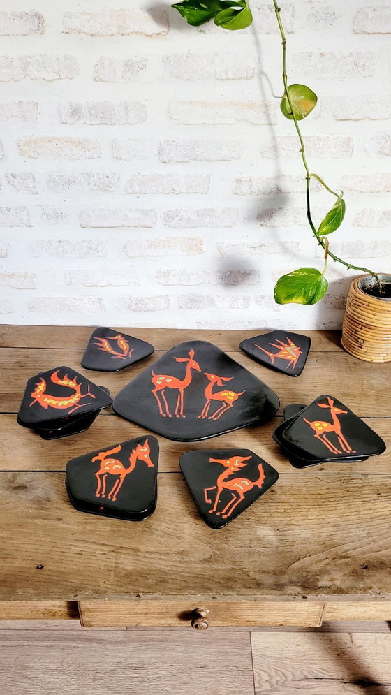 Realizzati a mano da ceramisti del Lago di Annecy, questi pezzi presentano audaci motivi animali dipinti in colori vivaci su uno sfondo nero: un contrasto tipicamente anni '50 che non passerà inosservato.