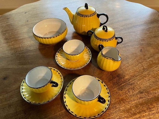 Servizio da tè in porcellana smaltata gialla con bordo e manici neri, composto da una teiera con coperchio, una zuccheriera con coperchio, una lattiera, una lattiera/ciotola per lavare i piatti e dodici tazze e piattini. Art Déco, Cecoslovacchia, ca. 1930.