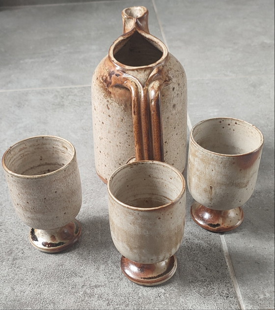 Servizio "Trio" composto da una brocca bulbosa con collo asimmetrico e beccuccio rastremato, che le conferisce una silhouette scultorea e autentica, particolarmente in linea con i gusti contemporanei, e tre tazze impilabili con piedistallo, realizzate da Jean-Pierre Prud'homme (firma "JP" incisa sotto la base e numerate).