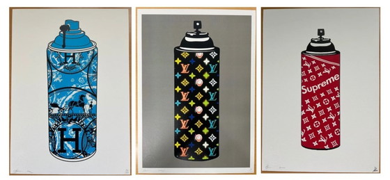 Tema: Serie di bombolette spray con disegni di Hermès, Louis Vuitton e Supreme.