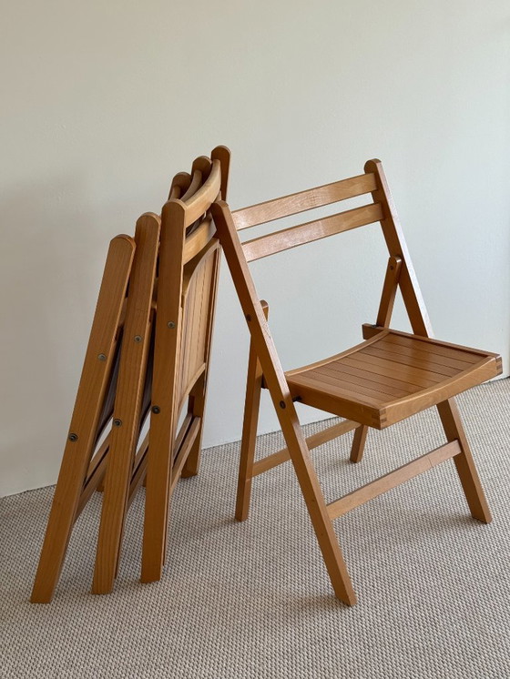 Queste sedie pieghevoli in legno di faggio degli anni '90 sono un'ottima scelta sia per risparmiare spazio che per la praticità. La finitura laccata leggermente lucida e il colore naturale le conferiscono un'atmosfera scandinava/di metà secolo.