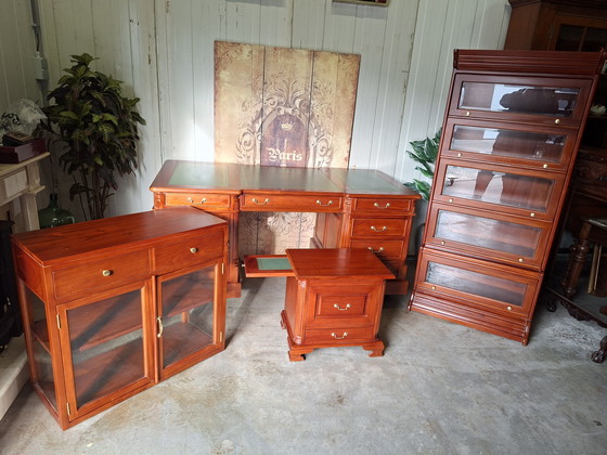 Questa suite completa per ufficio offre una soluzione elegante e funzionale per il tuo spazio di lavoro. Include una scrivania bifacciale, un mobile contenitore, una libreria e una cassettiera/vetrina, tutti realizzati in legno di alta qualità con una finitura calda e ricca. Questa suite per ufficio emana classe e raffinatezza, perfetta per un ambiente professionale o per un elegante ufficio domestico.