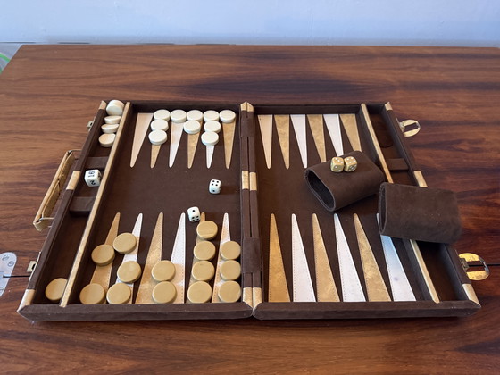 Elegante set da backgammon vintage degli anni '70, presentato in una custodia marrone caldo rivestita in tessuto effetto camoscio. I materiali morbidi e la delicata combinazione di colori conferiscono al set un aspetto raffinato e senza tempo.