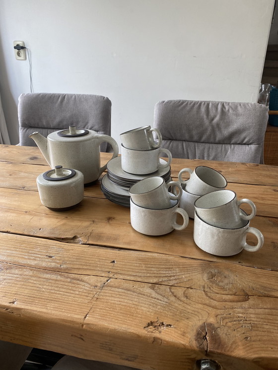 Questo è un grazioso set da caffè vintage di Zaalberg Holland, realizzato in ceramica di alta qualità. Il set presenta un bellissimo design a macchie color crema e marrone, che aggiunge un tocco rustico al momento del caffè. Include una teiera, una zuccheriera, tazze e piattini, tutti progettati con un'estetica minimalista. Perfetto per i collezionisti o per chi apprezza la classica artigianalità olandese. Il bellissimo design di Zaalberg Holland. Il coperchio della caffettiera/teiera è incollato al bordo. Per il resto, in ottime condizioni. (Un piatto presenta una piccola scheggiatura) 4 tazze da cappuccino, 4 tazze da caffè con piattini coordinati, caffettiera e zuccheriera.