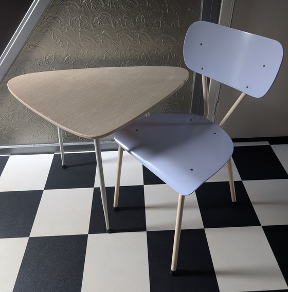 Set da camera da letto (tavolo con sedia) prodotto dalla fabbrica RaWi negli anni '50/'60. Il tavolo presenta il rivestimento originale. La sedia è in una delicata tonalità lilla/azzurro cielo. In perfette condizioni!
