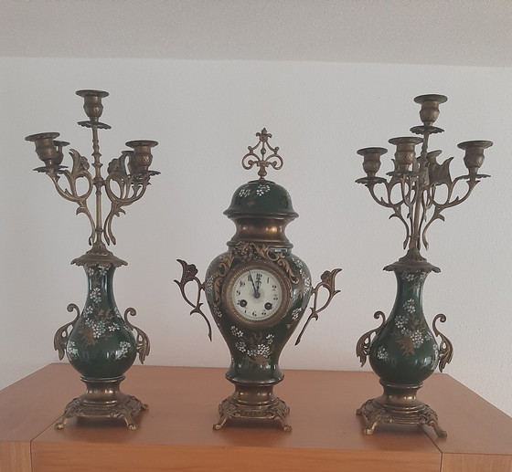 Aggiungi un tocco di eleganza classica ai tuoi interni con questo splendido set da camino antico in stile Art Nouveau. Realizzato in rame e porcellana, questo set, composto da un orologio decorato e due candelieri abbinati, emana raffinatezza con la sua ricca finitura verde e rame. L'orologio è decorato con delicati motivi floreali e un quadrante autentico; la chiave è mancante. I candelieri sono decorati con graziose volute e offrono spazio per diverse candele, creando un'atmosfera calda e invitante. Un candeliere è staccabile. Questo set è un'aggiunta perfetta a qualsiasi arredamento classico o antico e invita all'ammirazione e alla conversazione. Aggiungi un pezzo di storia alla tua casa con questo esclusivo set da camino.