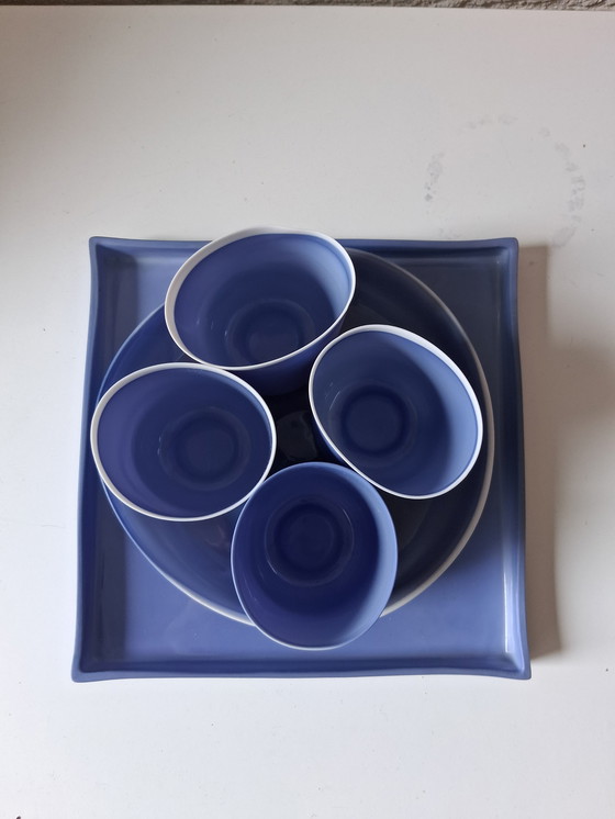 Questo bellissimo set da colazione in porcellana dell'artista Pieter Stockmans (1940, Belgio) è un esempio di design moderno. Il set è composto da una ciotola quadrata, una ciotola rotonda e quattro tazze cilindriche, tutte eseguite in un elegante colore blu. Il design minimalista e le finiture di alta qualità lo rendono un complemento perfetto per qualsiasi tavolo da colazione. Ideale per l'uso quotidiano o come regalo di stile. Molto bello anche come oggetto ornamentale in una parete o in una vetrina. Acquistato direttamente dall'artista. Stockmans è un artista famoso e conosciuto in tutto il mondo, anche nelle case reali. Visita il sito www.stockmans.com